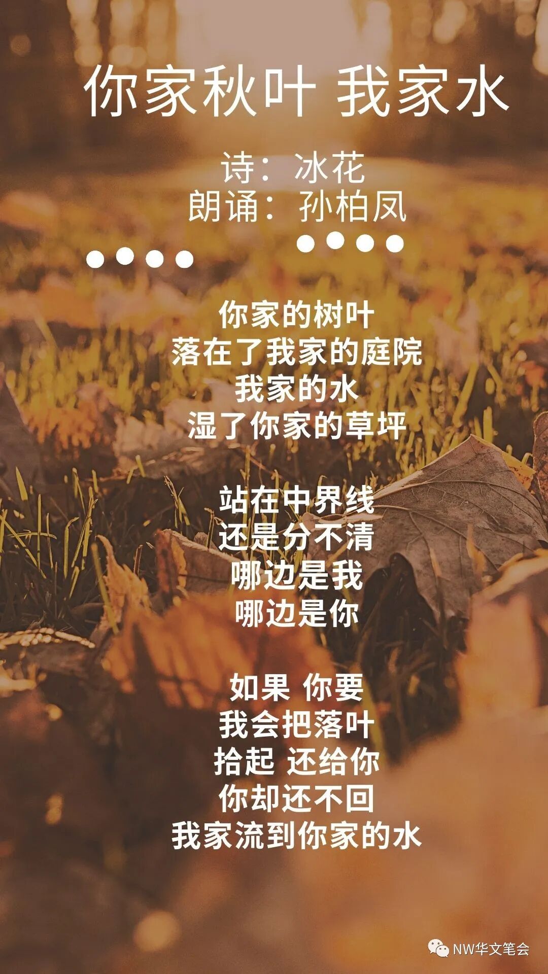 冰花的诗歌也常常取材于日常生活,如她的这首《你家秋叶 我家水》,就是有感于邻里间的交流而发。你家秋叶我家水音频:00:0000:42