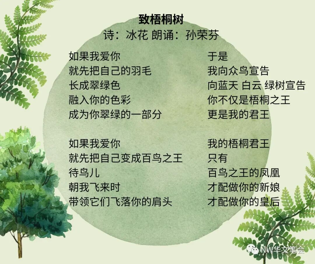 再一点,诗歌内容要紧扣主题。如冰花的《致梧桐树》,以“梧桐招来金凤凰”和“百鸟朝凤”的典故,突出了诗歌的爱情主题。致梧桐树音频:00:0001:18
