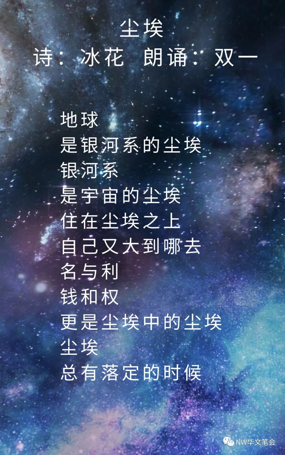 接着冰花谈到了诗的境界,她指出思想的高度决定诗品的高度和境界。以自然为首选,“自然”乃是诗歌的最高境界。她的《尘埃》一诗就是站在全宇宙的高度,视世人为蝼蚁,富有大格局。在翻译成英语后,饱受外国诗人和读者们的欣赏。她借用王国维在《人间词话》中对纳兰容若的评价,鼓励大家“以自然之眼观物,以自然之舌抒情”。