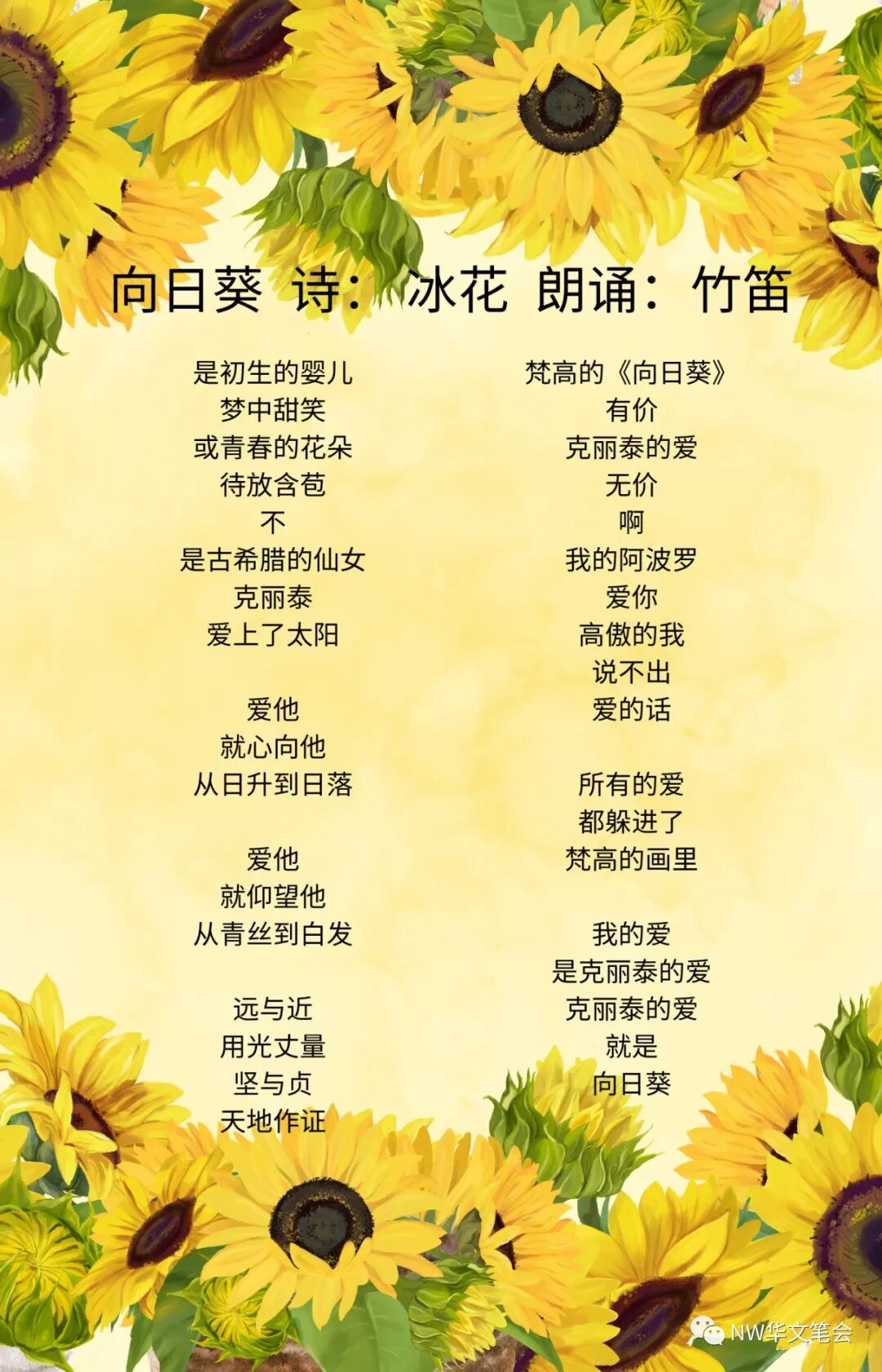 接着竹笛朗诵了冰花的《向日葵》,作者是在杭州附近看到向日葵花海后深深震动,将希腊神话和梵高名画《向日葵》结合,将爱情的经典主题升华。冰花说:“诗是灵魂的再现,灵魂让诗有生命力。”