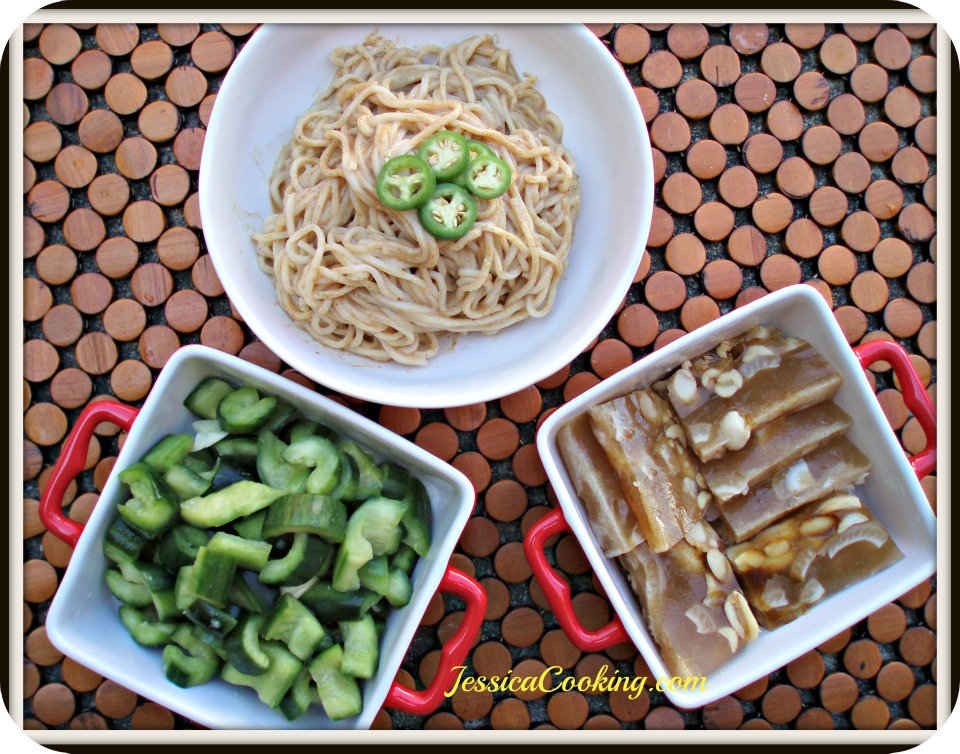 - 芝麻醬涼麵/蒜香黃瓜/花生凍子 Sesame cold noodles, Garlic cucumber, and Peanut Jelly
