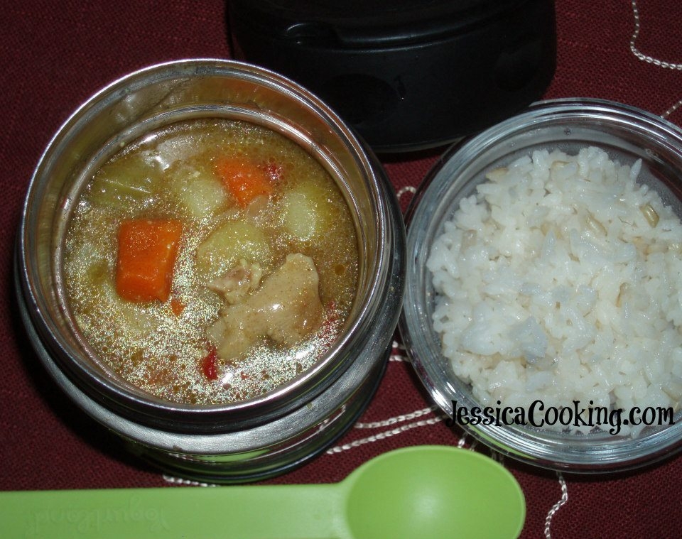 小朋友午餐- 熱咖哩雞飯-飯需分開裝,不然悶爛了,小孩不愛. 雖然飯會涼,但到午餐時段加入熱咖哩汁中溫度剛好!如果您將選購Jessica推薦的保溫杯品牌,溫度控制要小心,因為它的效果非常好.