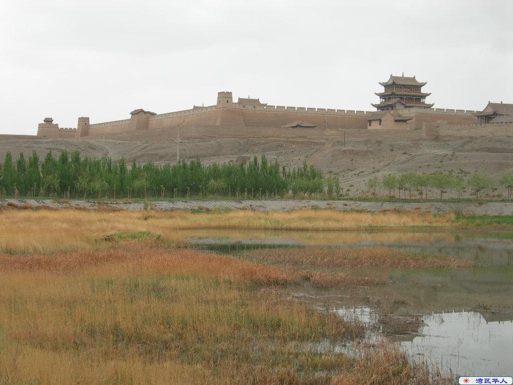 其实,在从敦煌到嘉峪关的火车上就可以看见城关,在茫茫荒漠中屹立着三座雄伟的楼阁,可能由于风沙的缘故,楼阁看上去也全是灰黄的颜色,没有江南楼阁的那种秀美,倒是平填了几分古朴.