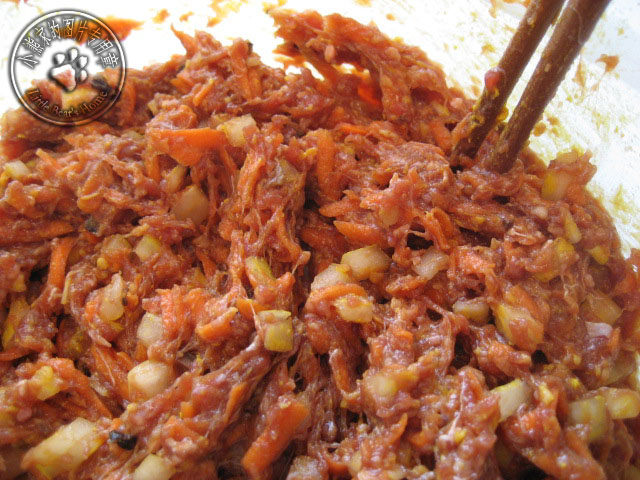 牛肉馅儿,胡萝卜,洋葱,香菇和鸡蛋。调料的事儿过一会儿再说。