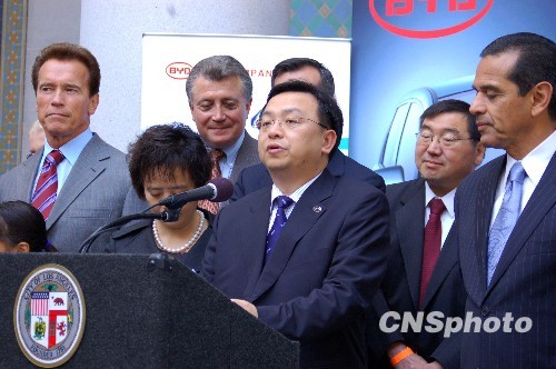 描述: 中国比亚迪股份有限公司董事局主席王传福(中)与加州州长阿诺·施瓦辛�