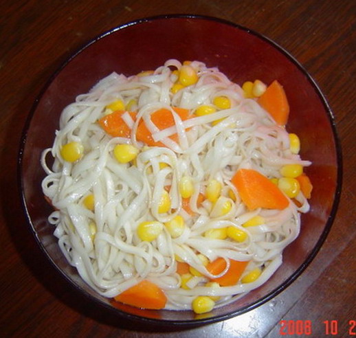 4、等面煮好就把面捞出,和炒好的胡萝卜丁及玉米丁一起放进拌料碗里拌匀。
