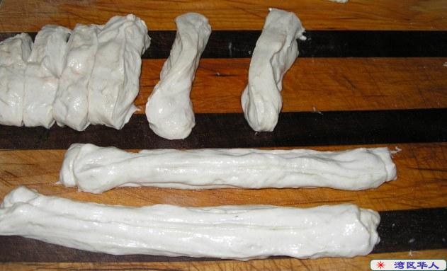 (如果怕麻烦,也可以用一个盘子取代面板,把面坯压扁,用餐刀划两三道口,炸