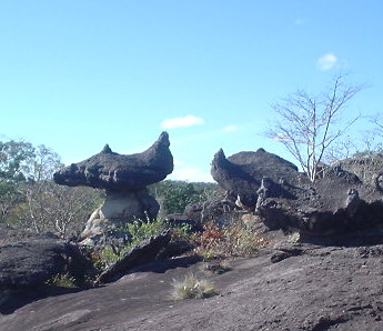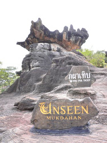 “山”的全称是布卡特泰国国家地质公园(PHUPHA THOEP NATIONNAL PARK),在MUKDAHARN,泰国与老挝的边界,湄公河近在咫尺。岩石的年代已经消失,小导游说可以追溯到寒武太初,是鸡跟恐龙一样大的年代。途中也确实发现立有标记,意思是此处有恐龙的遗迹,但已被人偷走。
