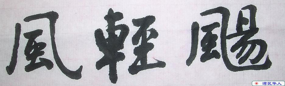 ,CciTXf 8pXKO"u], 献丑贴照片上来,只有三个字,今天写的两篇里面最好看的三个字,呵呵。临《归去来辞》,写几句就不行了,灵机一动,这“舟遥遥以轻扬,风飘飘而吹衣”,正好摘出“风轻扬”当作签名档。GG 看了说,写字要竖着写,不然也要从右向左,你这个算什么~~~ 这个没文化的家伙这次说的倒是没错,就当作“扬轻风”好了。