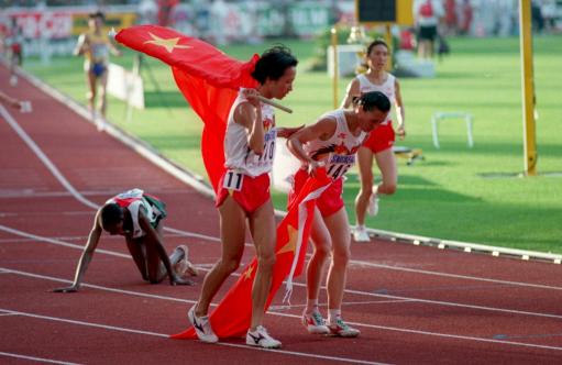1997年 馬家軍東山再起,第二梯隊的姜波、董豔梅在八運會上雙雙打破女子5000米世界紀錄,董豔梅等還包攬女子万米前三名