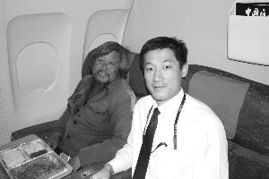 下午2点半,飞机起飞了,徐超朝窗外看个不停,说:“云真好看。很稳当,比坐火车舒服。”记者告诉他,如果有什么需要,比如要去洗手间什么的,可以跟记者说。徐超却说,“我不知道飞机上有厕所,我不想给飞机上添麻烦,所以上午没喝水,连午饭都没敢吃。”徐超还从口袋里掏出两个干净的塑料袋,“我连垃圾袋都准备了,怕飞机上没地方吐痰。”
