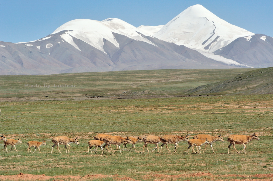 这群在雪峰下面拖儿带女、黄不拉及的就是大名鼎鼎的藏羚羊。有生第一次这么近距离的观察到藏羚羊,感觉挺幸运的。这是在回程时在青藏线的雪峰下拍到的。