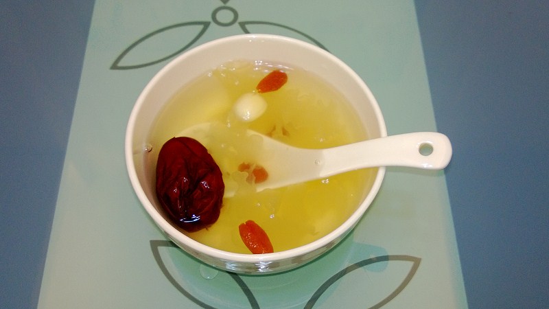 银耳泡发(大概1小时左右),洗干净去蒂撕成片,放入水中大火煮开,再文火煮大概半小时,放入红枣枸杞煮10分钟,出锅前放入冰糖煮化即可。