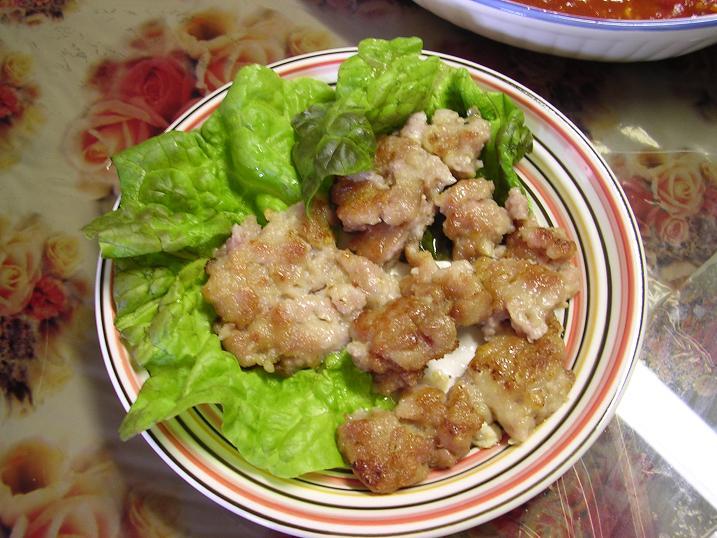 煎肉饼(昨天不是做了蒸豆腐么?那割下来的嫩豆腐,跟肉末搅好,煎成这个)