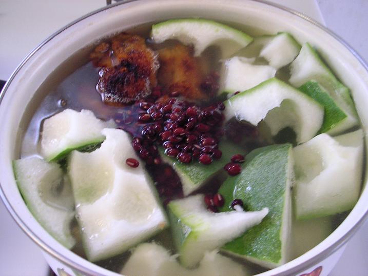 冬瓜连皮, 赤小豆, 烧猪脚. 这个汤去水利尿消暑.