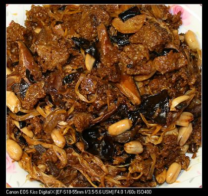 年初一的中饭:蚝油牛肉丝,清炒豌豆芽,芥兰炒培根,酸辣蕨根粉,干切牛肉,无敌鸳鸯腿(一只鸡腿一只鸭腿),点心两道:糯米圆子及八宝饭。