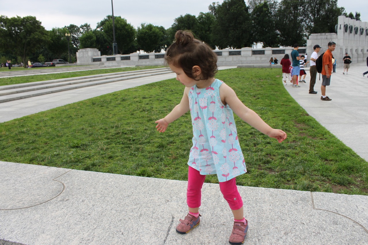 坐在林肯纪念堂前的台阶小憩一会儿,欣赏一下倒影在倒影池里的各种建筑的身姿,小妞吃完了她的午餐。接下来去看韩战纪念碑。韩战纪念碑是一组士兵的铜雕塑,雕塑后面是三片拼接的大理石墙面,其中一面墙上映着群雕的的影像。另外一面墙面上喷有战时士兵的各种照片。群雕前,大理石墙面旁是一个花岗石浅池,叫纪念池。池沿上刻着战争中死亡、受伤、失踪和被俘的士兵人数。不远处有一块小碑,上刻:"Our nation honors her sons and daughters who answered the call to defend a country they never knew and a people they never met." 再远处,是一面花岗岩墙面,上刻着: Freedom is not free.