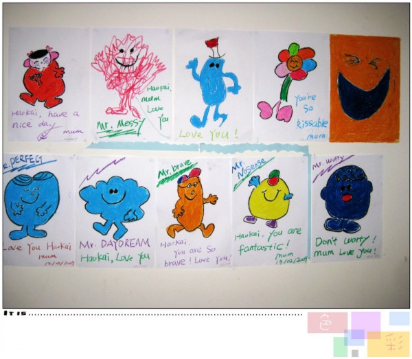 而我,不知道从什么时候起,开始学会在深夜里品味平静的滋味,我在慢慢流淌的音乐里,用心画下一幅幅在小宝眼里稚嫩可爱诙谐生动的图画,这真是一件很好玩儿的事,我发现自己的生命在那些信手涂抹的温暖鲜艳的色彩中逐渐丰盈不那么无趣荒芜;我象个真正的小孩子,看自己简单的不绕圈子的笨拙的夸张的变化无穷的线条,在深夜里咧嘴笑;我画火红火红的怒吼、五颜六色的七彩花朵、两手叉腰生气的妈妈、一团醒目亮眼的红色MR。MESSY和挂着陶醉微笑的蓝色MR。PERFECT。。。。我画出这个世界纯粹的小小的美和妈妈对小宝的满满的爱。