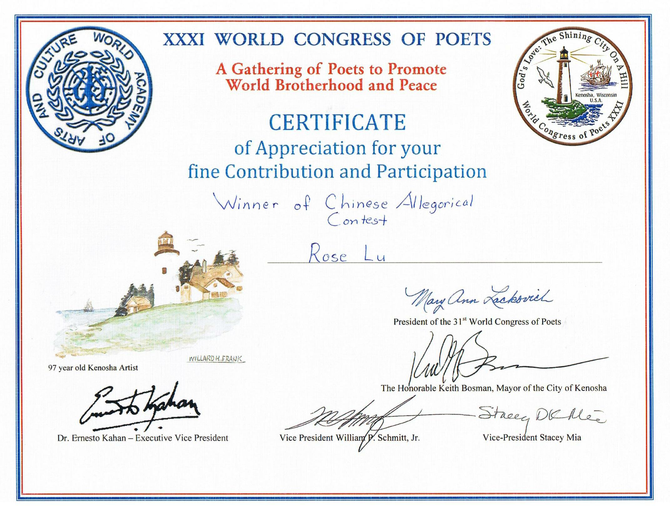 冰花 ( ROSE LU )在第31届世界诗人大会获奖作品